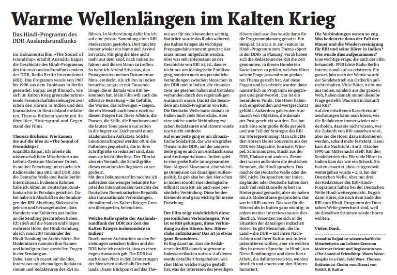 Der Dokumentarfilm „The Sound of Friendship“ versucht eine Nachzeichnung aus der Perspektive seiner im heutigen Deutschland und Indien ansässigen Journalist:innen und Hörer:innen. Gezeigt wurde der Film am 19. Oktober im Funkhaus Berlin | Saal 2 im Block B | Trailer: