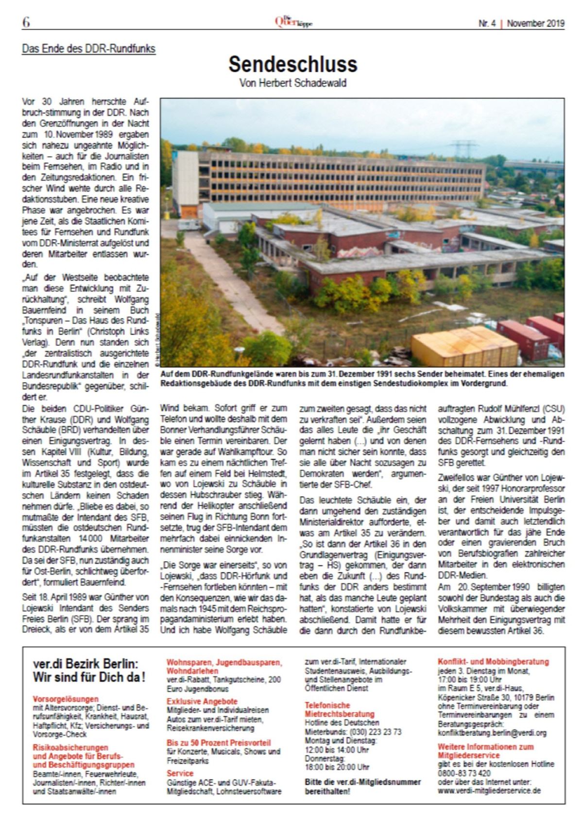 Der Zeitzeuge Herbert Schadewald ist Autor des Beitrages auf Seite sechs der 4. Ausgabe der "Querköppe" 2019 der Ver.di Seniorinnen und Senioren sowie eines gleichnamigen Artikels vom 7.12. in der "jungen Welt" mit dem Untertitel: Das Ende vom Rundfunk der DDR. Eine Reminiszenz in Bildern | Die Bildunterschriften des genannten Beitrags hat Herr Schadewald nicht zu verantworten. Auf dem Gelände arbeiteten 3500 Leute. Der Betriebskinderkarten befand sich außerhalb der DDR-Rundfunkzentrums. Und die gezeigte Technik befand sich damals so auch nicht im Zimmer des Intendanten. In dem Zusammenhang der Verweis auf einen Beitrag von André Scheer | "Junge Welt" vom 6.11.2019: Umbenannt und abgeschaltet | Der Rundfunk der DDR wurde restlos abgewickelt