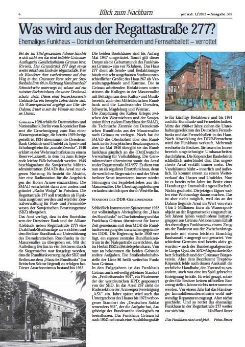"Schließlich kommt es im Spätsommer 1952 zur vollständigen Abriegelung des Haus des Rundfunks in Charlottenburg und das Funkhaus Grünau übernimmt für kurze Zeit gemeinsam mit dem MDR die Rundfunkversorgung der inzwischen gegründeten DDR. Die Regierung hatte 1950 verfügt, ein eigenes zentrales Rundfunkzentrum in der Nalepastraße zu errichten, das im Herbst 1952 in Betrieb gehen kann. " Zitat von Zeitzeuge Wolfhard Besser | Der Beitrag mit der Frage danach, was aus der Berliner Regattastraße 277 wird, ist Teil der jot w.d. 1/2022er Ausgabe 305. Ein Klick auf das beigefügte Abbild lädt zum Lesen des vollständigen Artikels ein: