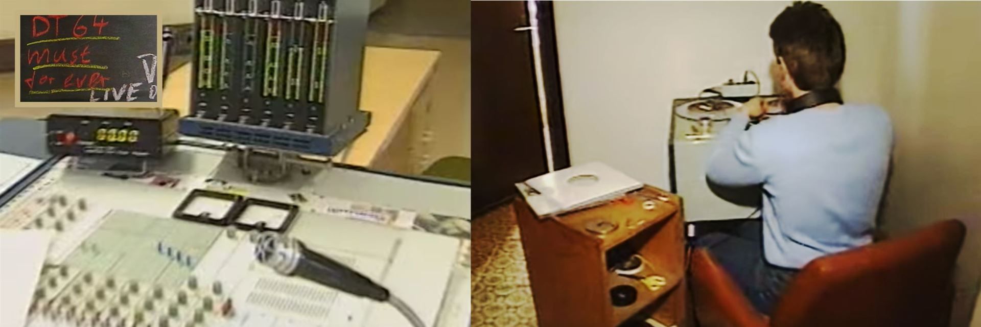 Radio DDR - später Radio Aktuell: "Musikalische Luftfracht" mit Moderator Peter Niedziella und Musikredakteur Karl Lorenz | Screenshot-Bildlink zu geteilten facebook-Einträgen, u. a. mit Aufnahmen der letzten "Musikalische Luftfracht"-Sendung, die erst 2011 ins Netz gestellt wurden | Bildautoren unbekannt. Einige der Fotos gewähren Einblicke in die ehemaligen Räumlichkeiten des inzwischen zerstörten "Blockes E-T" (siehe auch Aussensichten der "Blöcke E-R|T in der obigen Imagemap).