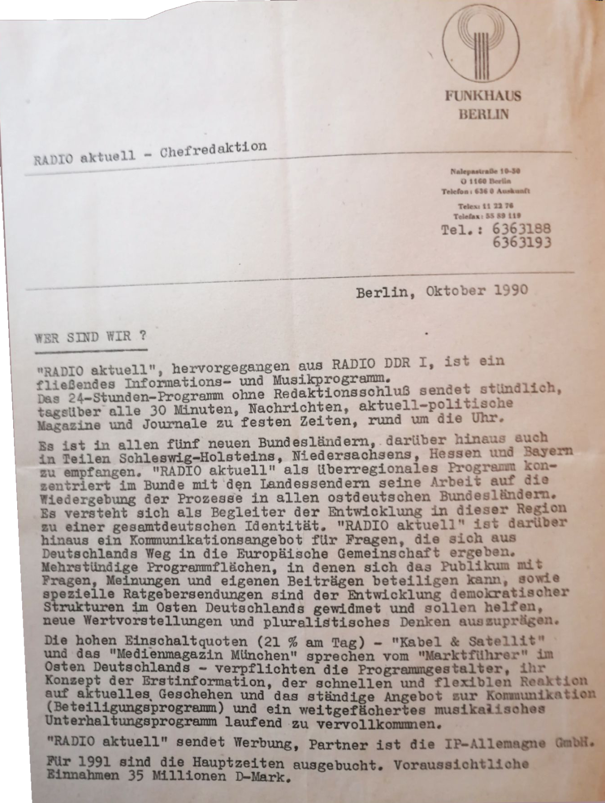 "RADIO aktuell" als überregionales Programm konzentrierte im Bunde mit den Landessendern seine Arbeit auf die Wiedergebung der Prozesse in allen ostdeutschen Bundesländern. Siehe auch Doku aus dem Privatarchiv von EH