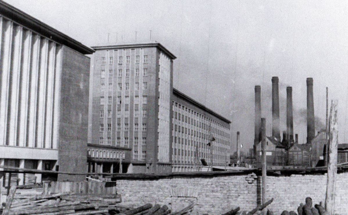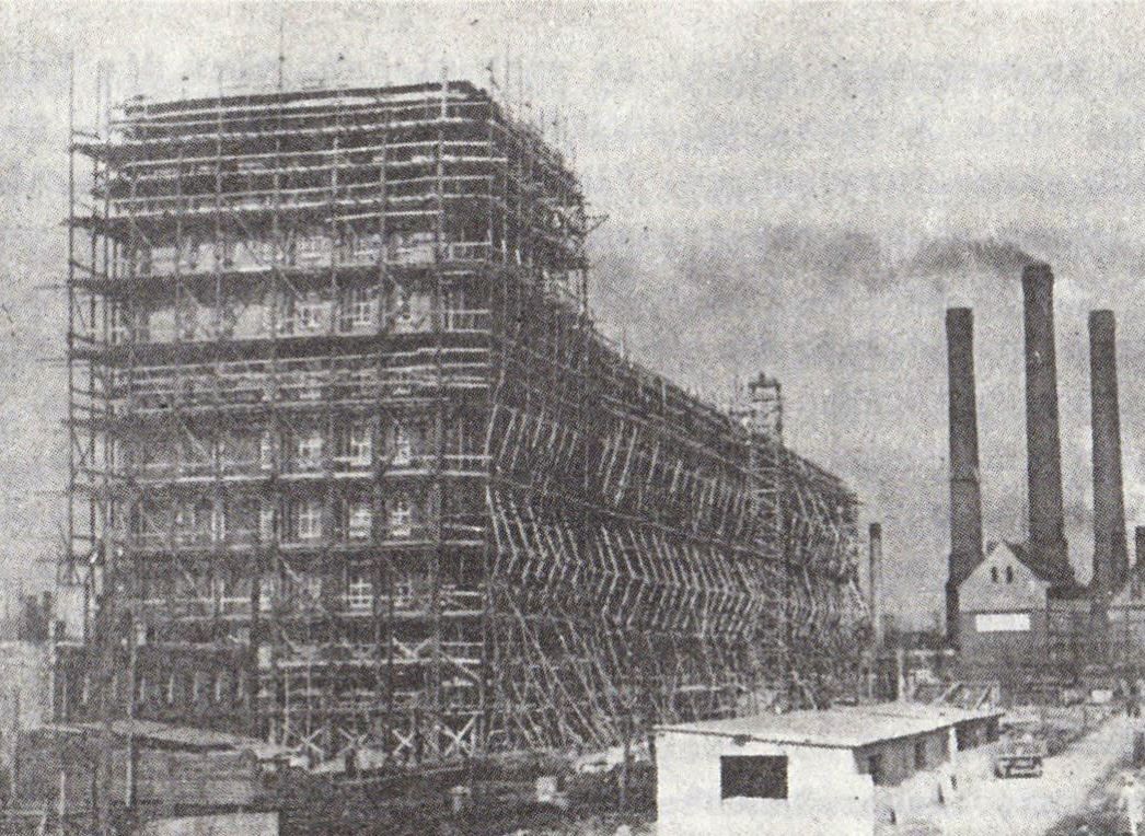 Das Foto entstand etwa im Spätherbst 1951 (der Baubeginn war im Juni 1951). Es zeigt die bereits rohbaufertigen Etagenaufsätze auf dem lang gestreckten Hauptkorpus (eine Etage) und dem Turm (drei Etagen). Der Betonskelettbau der einstigen Furnierfabrik erhielt eine neue Fassade aus rotem Klinkermauerwerk, die Franz Ehrlich durch Lisenen aus Sandstein vertikal gliederte.