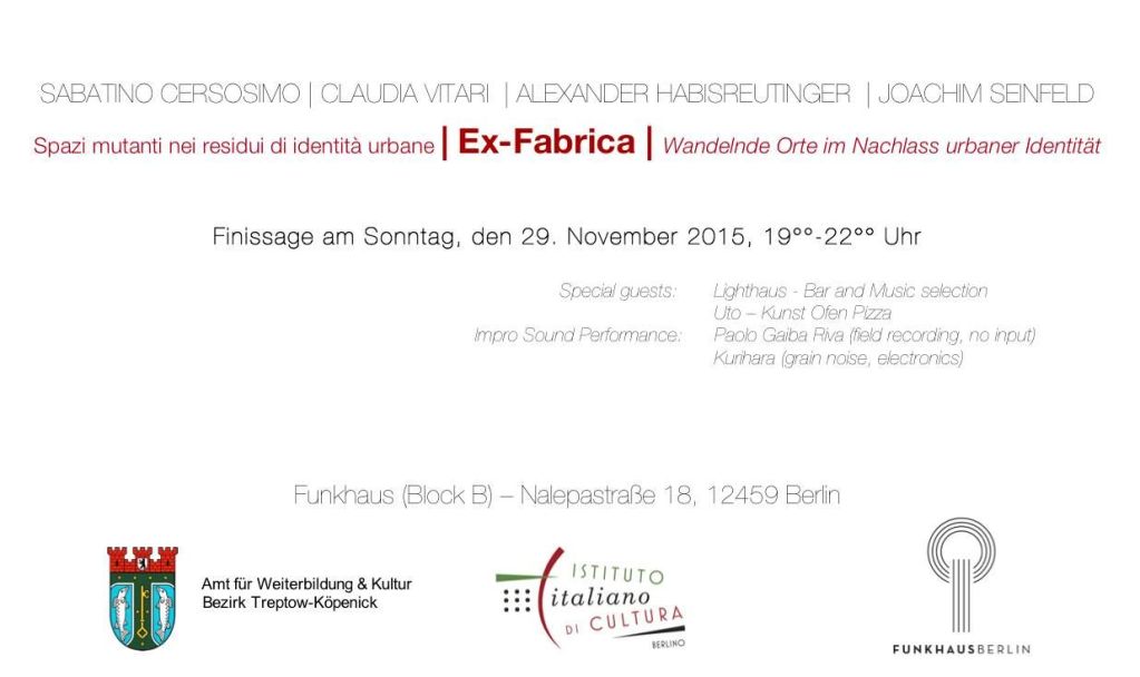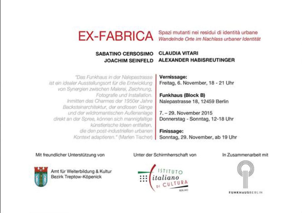 Für die erste Station der Ausstellung "Ex-Fabrica" haben Vitari und Cersosimo zwei deutsche Künstler zur Kollaboration eingeladen. Ähnlich wie Vitari's und Cersosimo's Arbeiten, zeigen die Arbeiten von Alexander Habisreutinger und Joachim Seinfeld Spuren, welche die post- industrielle Umgebung ihrer Ateliers im Funkhaus, der früheren Pruduktionssta tte des DDR Rundfunks, widerspiegeln.
