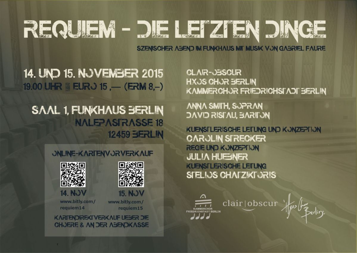 Der 'HXOS Chor Berlin und der Kammerchor Friedrichstadt werden am 14. und 15. November unter der Regie von Julia Hübner, der musikalischen Leitung von Carolin Strecker und Stelios Chatziktoris und gemeinsam mit den Solisten Anna Smith und David Ristau ein besonderes Projekt realisieren. Das Requiem von Gabriel Fauré dient als Ausgangspunkt, um sich musikalisch und szenisch mit dem Fin de Siècle und den letzten Dingen auseinanderzusetzen.