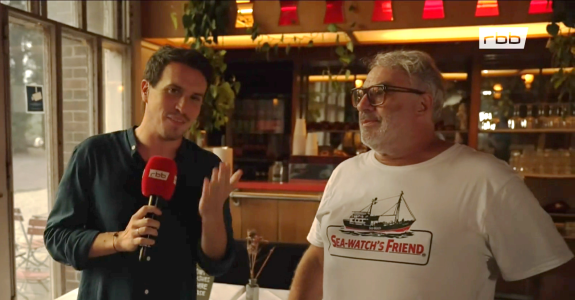 Uwe Wassermann - einst Redaktionsmitglied von DT 64 - erinnert sich in einem am 11. Juli 2025 ausgestrahlten Beitrag an seine Zeiten in der kleinen Stadt am Wasser - ab Minuten 58:04 I rbb-Mediathek. Zu sehen im Screenshot der Koch Stefano hinter der Glasscheibe der Milchbar.
