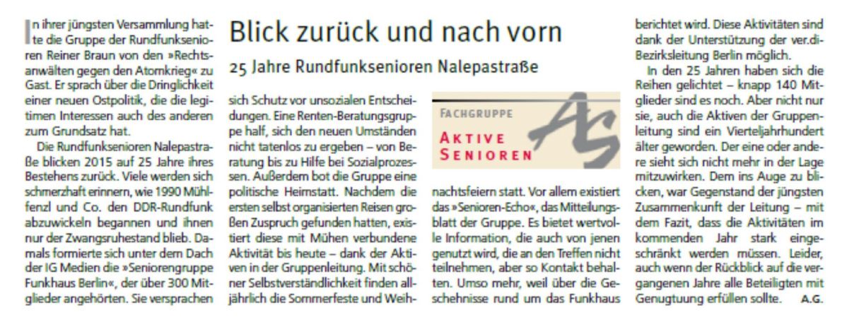 An dieser Stelle der Verweis auf einen geteilten Artikel von Zeitzeugen Wolfhard Besser aus der Mitgliederzeitung des Fachbereiches Medien, 24. Jahrgang Nr. 5, Kunst und Industrie Berlin-Brandenburg, Dezember 2014: